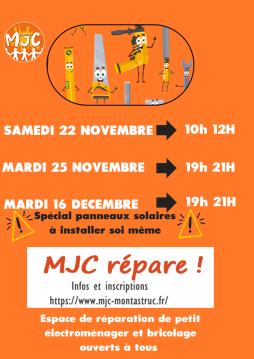 Les bénévoles de la MJC proposent un espace de réparation de petit électroménager et bricolage ouverts à tous , RDV les derniers mardis de chaque mois .