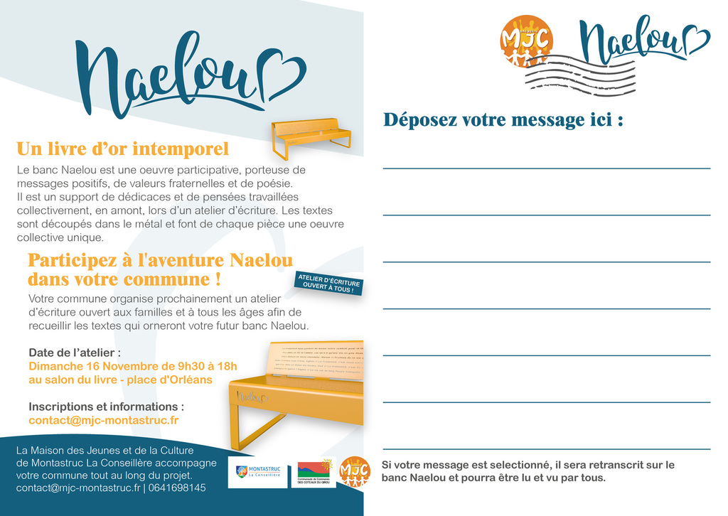 Déposez votre message, à partager et à rêver, ces mots seront ensuite gravés sur le banc NAELOU de votre commune.